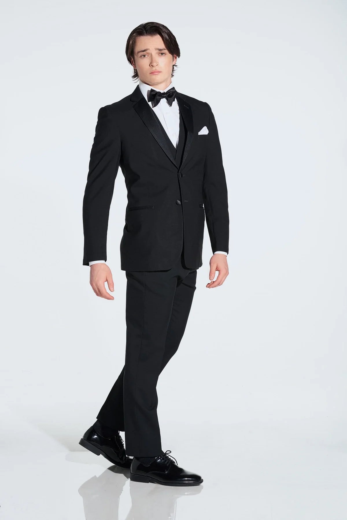 This tuxedo rental consist of the jacket, pant, shirt, vest, bow/tie, stud inserts, cufflinks and pocket square.