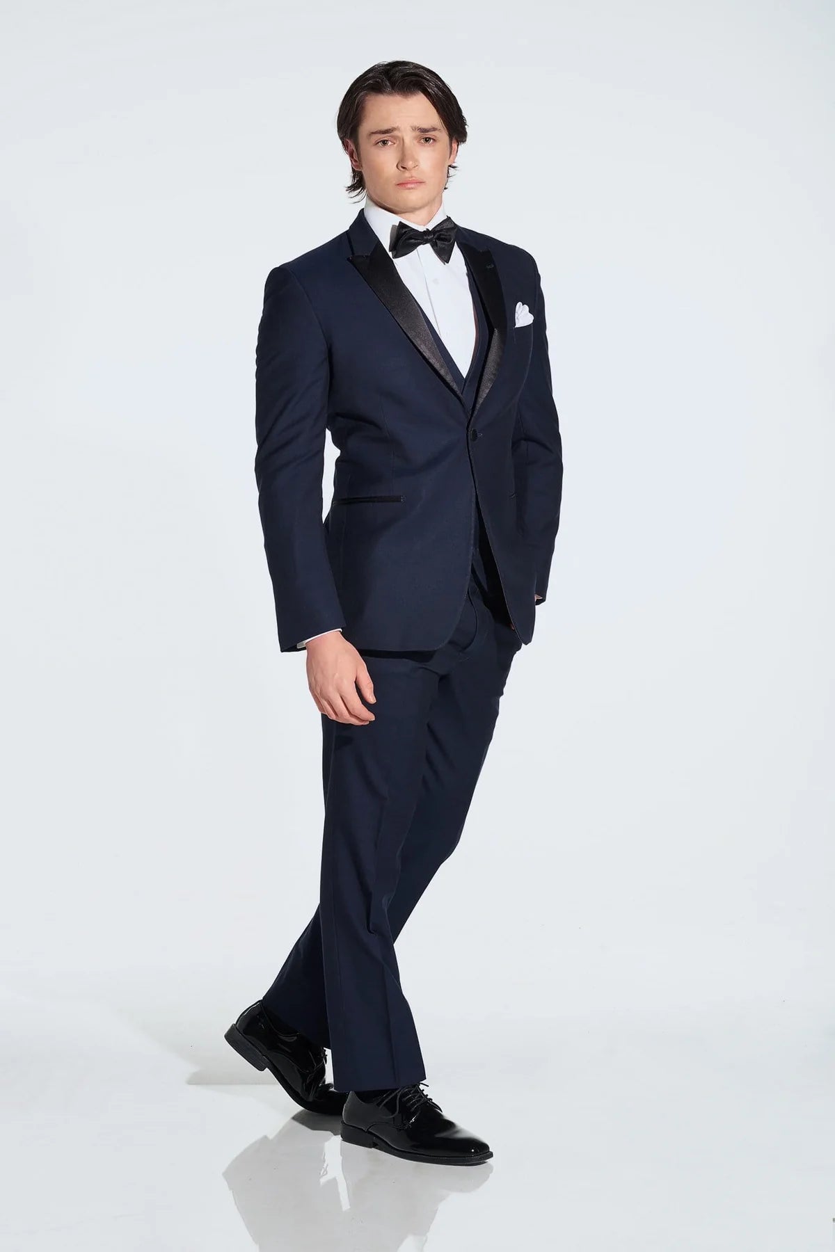 Our BLAKE Midnight Blue Tuxedo features a full black satin jacket with a peak lapel, a single front closure, double satin besom pockets, and has a double vent located on the back. The BLAKE tuxedo jacket also has a chest pocket, perfect for a traditional or custom pocket square. Pair this jacket with the matching straight-leg tuxedo pants so a sophisticated look.